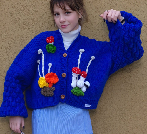 Chunky Lavender Handknitted Cardigan with 3D White Roses & Mushrooms – Oversized Soft Girl Knitwear, Handmade Crochet Pullover, Bobble Sleeves, Cozy Cottagecore Layering Sweater, Artisan Handmade Knit, Gift for Her