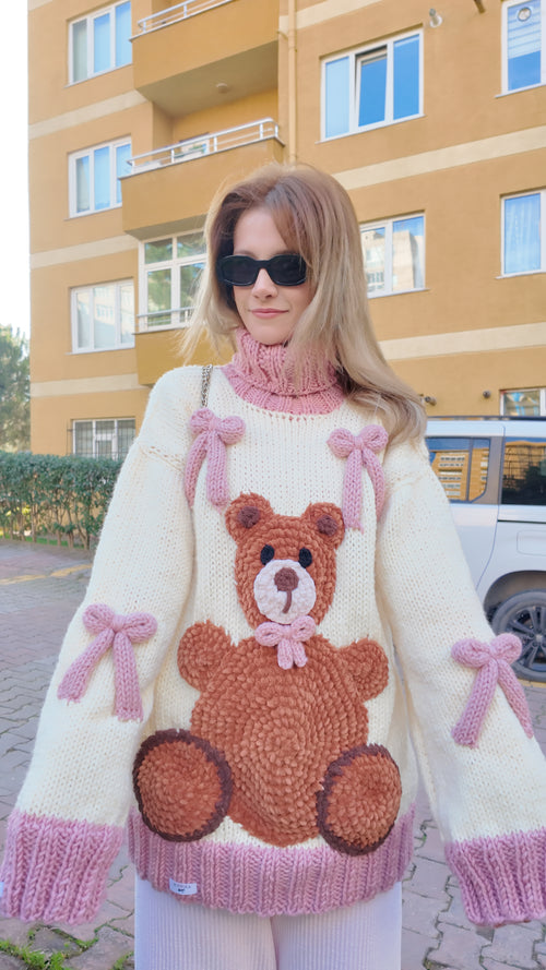 Valentine’s Day Special Handcrafted Oversized Knit Sweater with Amigurumi Teddy Bear Appliqués, Bold Red Heart Details, and Cloud-Soft Puffy Balloon Sleeves Teddy Love